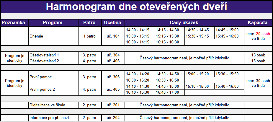 Na co se můžeš těšit? U nás se nudit nebudeš! Ukážeme ti netradiční chemické pokusy - oheň který nepálí, Faraonova hada a jiné. Naučíme tě srdeční masáž a předvedeme první pomoc v životě ohrožujících situací. Zkusíš si celou řadu odborných výkonů - měření tlaku, aplikace injekcí, odběr krve a další. Setkáš se s vedením školy a celou řadou učitelů. Je pro nás důležité, aby nás co nejlépe poznal/a, tak neváhej, přijď a zažij to na vlastní kůži.